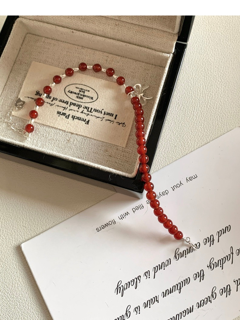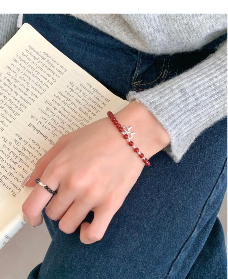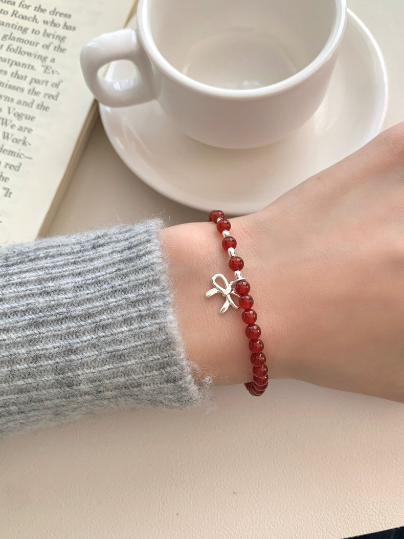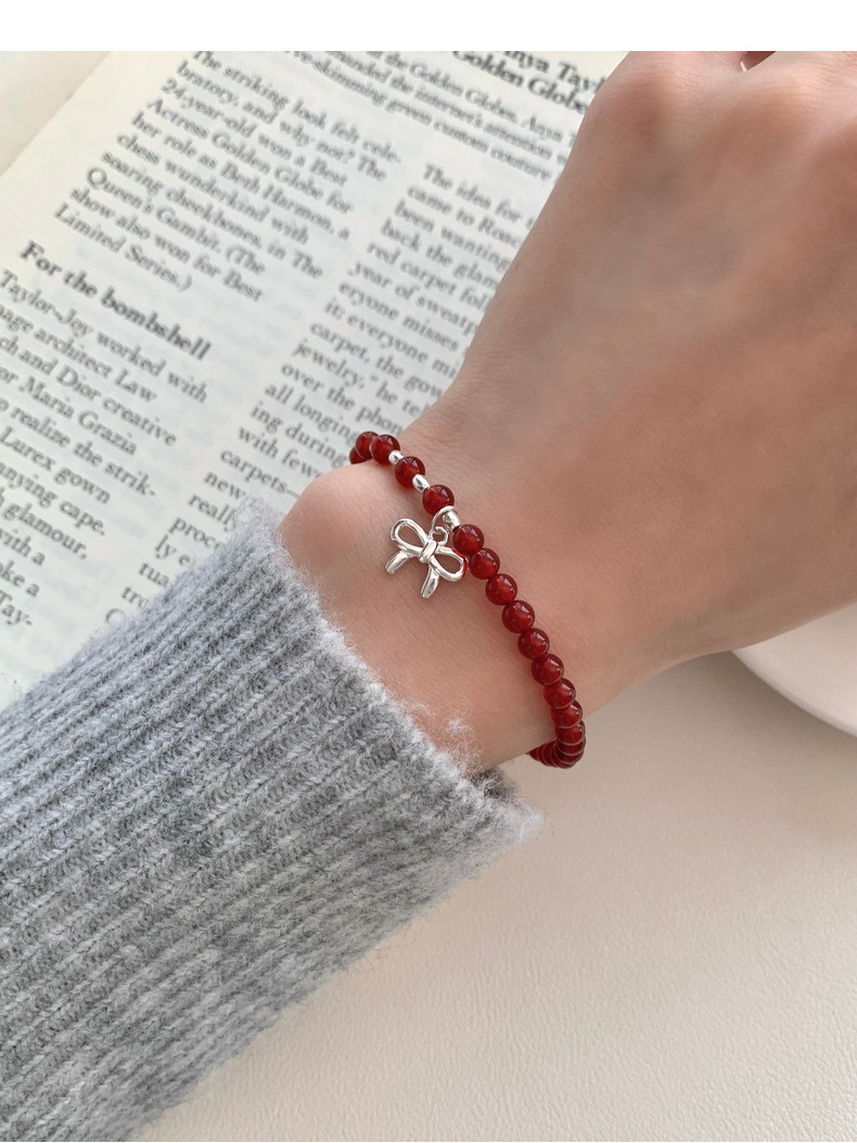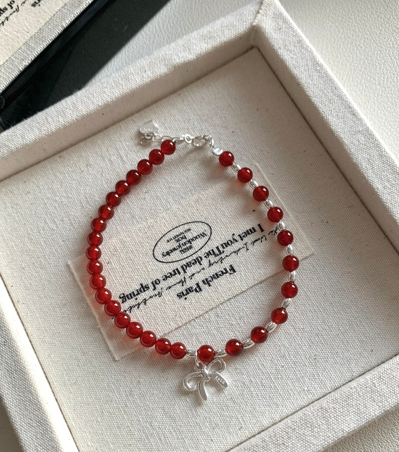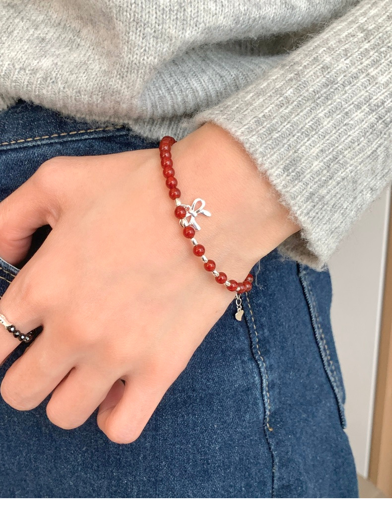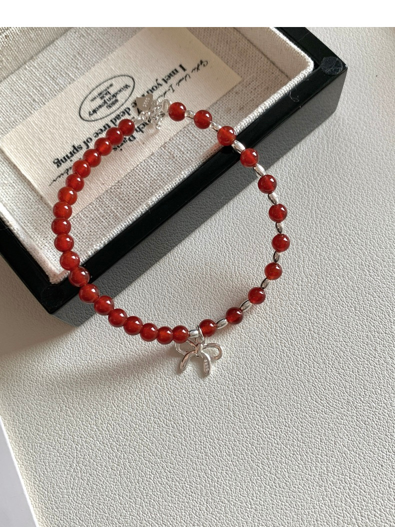 S925 Sterling Silver Bow & Red Agate Bracelet - Minimalist Luxury Beaded Chain (Trendy INS-style Stackable Jewelry)